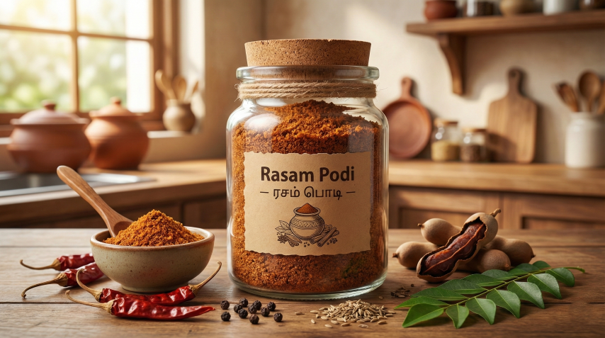 Made with pepper, cumin, red chillies, and herbs, this Rasam Podi enhances the taste of traditional rasam. Perfect for comforting soups, immunity-boosting drinks, and rice accompaniments.